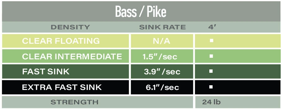Short & Powerful. The Bass/Pike polyleader turns over big bugs in the worst of conditions. Just add a short piece of mono or wire to find out what this baby can do. This short powerful PolyLeader is essential for turning over large wind resistant divers or bass bugs. Add only a short length of mono for perfect accuracy and maximum turnover with every cast. For Pike fishing, include a short section of wire at the tip as a bite guard. Available in 4’ lengths.