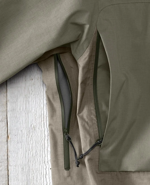 The Men’s Pro Wading Jacket is made of a highly durable custom-woven, three-layer shell with a subtle heather pattern. Waterproof and breathable fabric has fully taped seams for added weatherproofing with integrated Dolphin Skin Cuff system for additional water-resistance. Brushed micro suede chin guard and zippered handwarmer pockets adds comfort. Rubberized tabs for tool docking offer easy access to tools and forceps. YKK AquaGuard® water-resistant zippers, water-resistant side zips for ventilation and easy access to waders, and two large zippered water-resistant vertical storage pockets. Interior zippered security pocket and internal power mesh pocket for additional storage. Three-way adjustable storm hood with laminated brim. Integrated fly patch and a rear yoke D-ring for net attachment. DWR finish (Durable Water Repellent) repels water from fabric surface. 20K Waterproofness and 15K Breathability rating. 100% polyester with PU lamination.