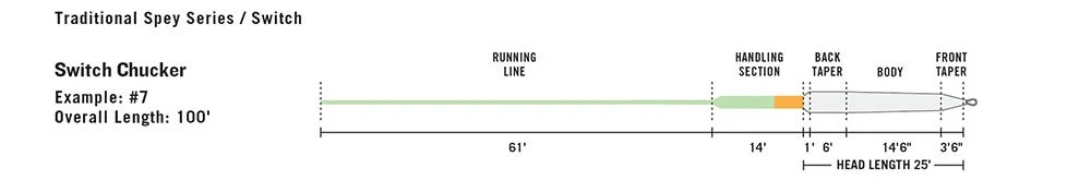 The Switch Chucker is a very easy casting line, with a short head and plenty of weight at the front for casting indicators, sink tips and large flies. The line features a long front taper that makes it a pleasure to roll and spey cast with, and a short back taper that allows anglers to shoot for distance with ease. An integrated running line ensures there are no loop-to-loop connections running through the guides. The Chucker is the best choice of Switch line for fishing in tight spaces and for any Switch rod caster who wants the casting to be as easy as possible.