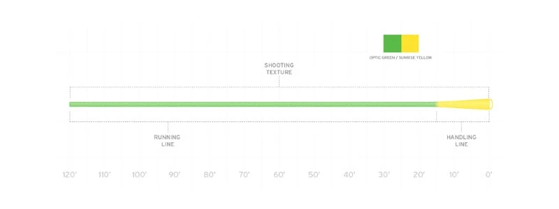 The textured Floating Dragon Tail shooting line solves one of the major issues with using shooting lines and heads. The Dragon Tail tapers from .038″ to .075″ where it meets the shooting head, providing a less drastic transition from shooting line to head, which equates to more line control. The Mastery Texture reduces friction, delivering longer casts, and a color change signals where the taper begins.